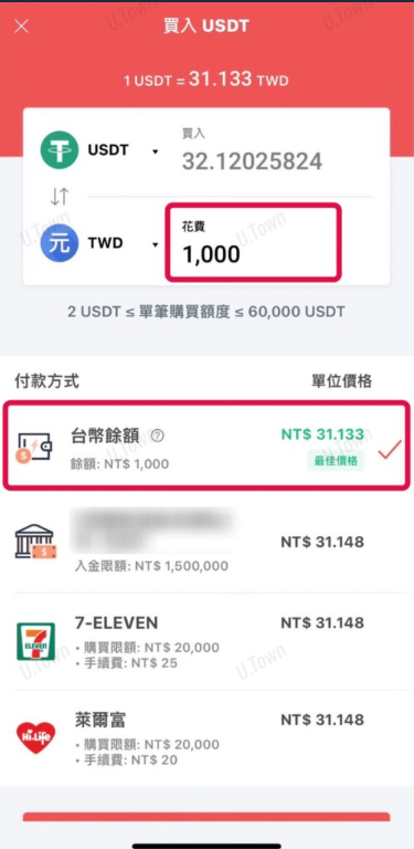 6.输入您想买入的USDT金额,付款方式选择台币馀额,MaiCoin可以使用台币入金馀额买入(汇率最佳)